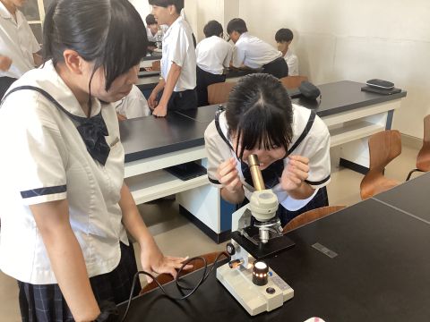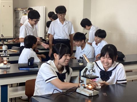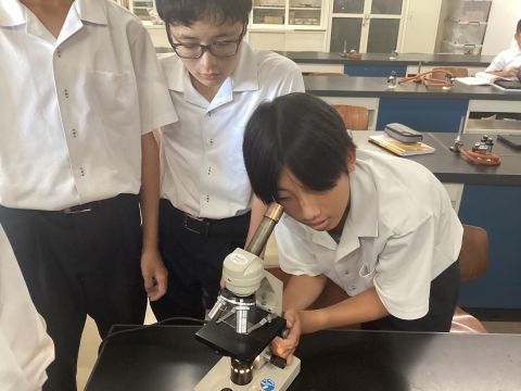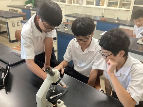 2年生の理科実験の様子です。ネギの細胞を染色液で核を赤く染めて観察しています。