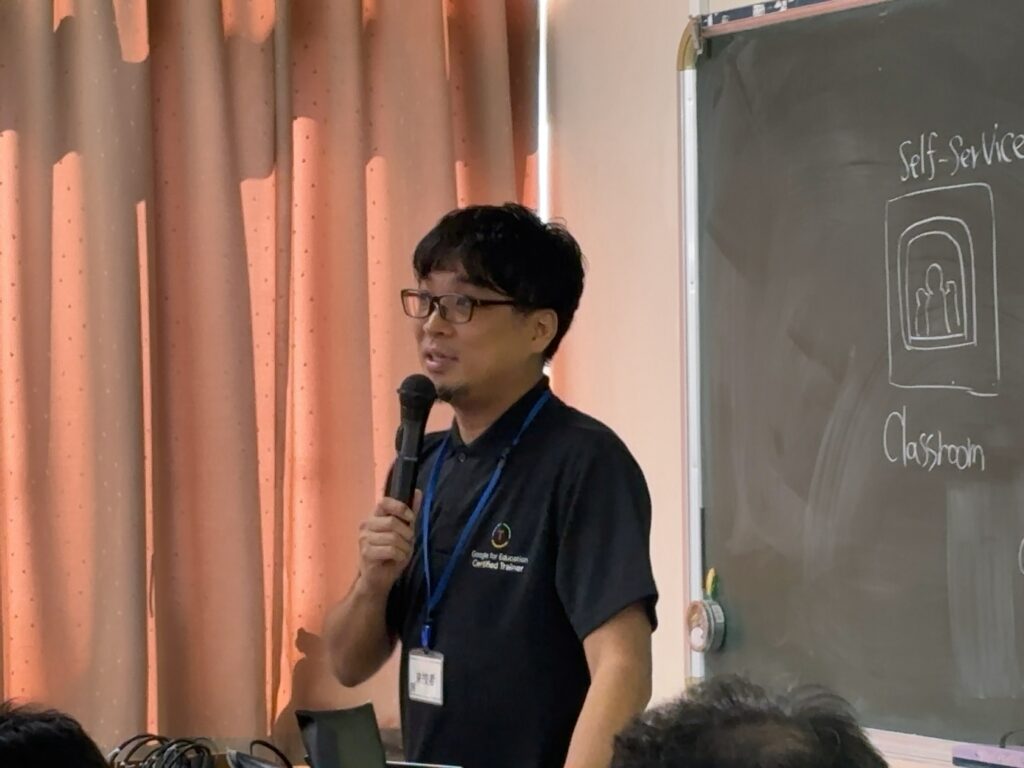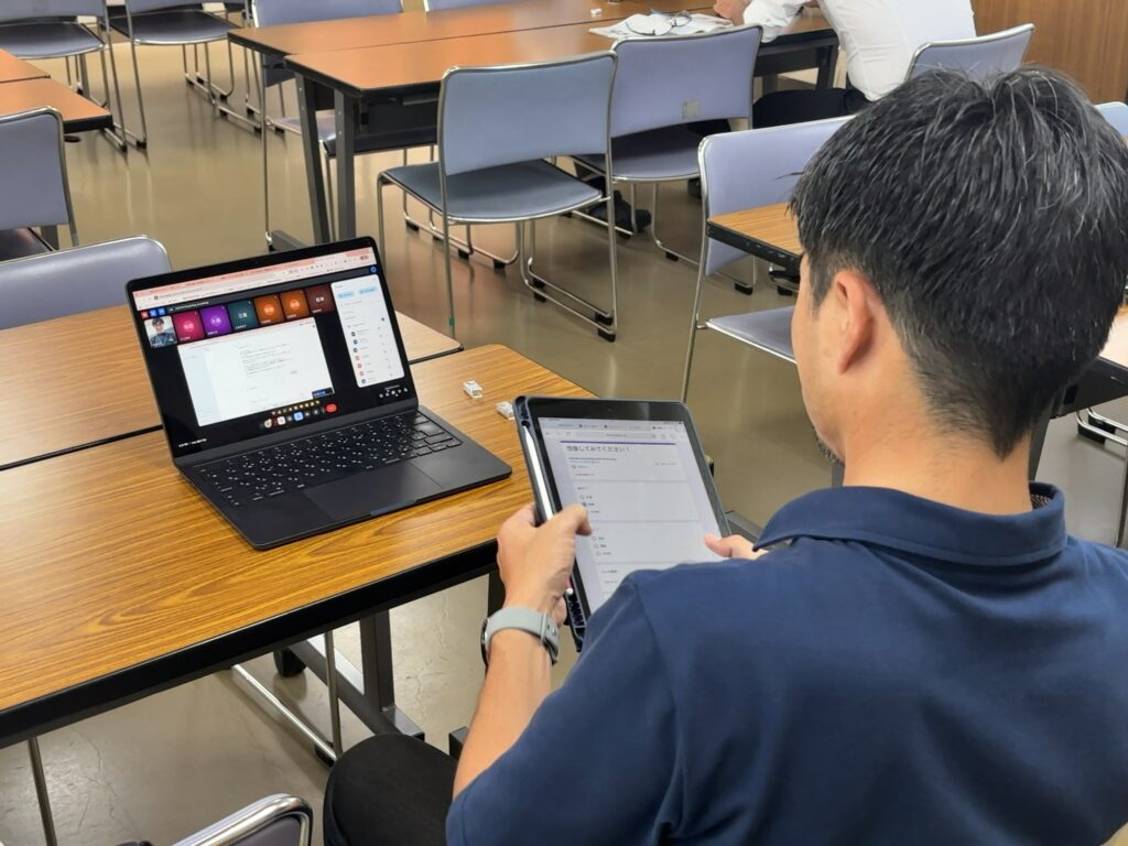 上の写真は、別の場所にいた先生に向けてGoogleMeetで同時配信している様子です。離れた場所でもパソコン一つで研修ができるようになりました。本当にすごいですよね。
