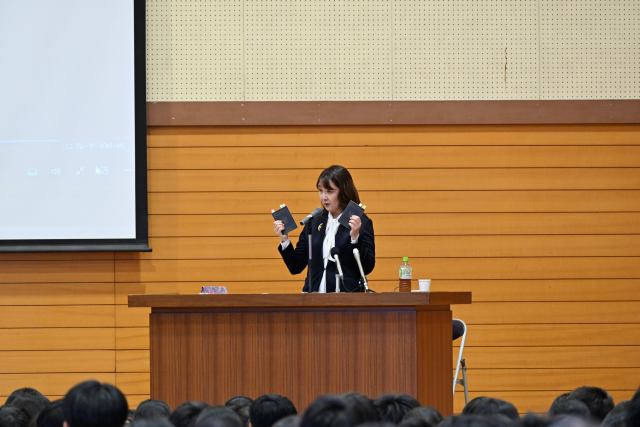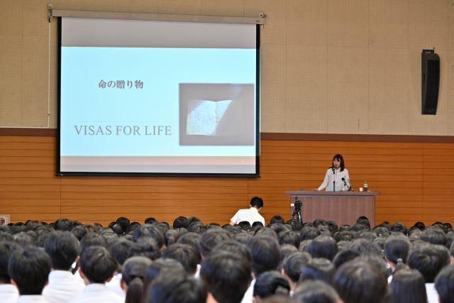 講演会では、第二次世界大戦中、ドイツから迫害されていたユダヤ人たちにビザを発行し、多くのユダヤ人の命を救った外交官「杉浦千畝」の人となりや、千畝に命を救われた人々の声が紹介され、生徒たちも熱心に耳を傾けていました。