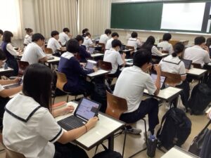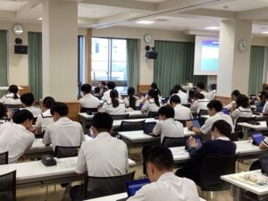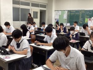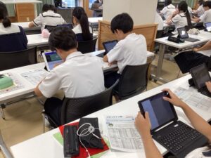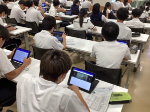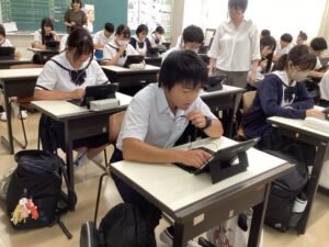1学期にも実施したオンライン英会話の第3弾。年間9回実施(授業で5回、夏休み4回)する中で、今回は7回目。夏休みに教室のWi-Fi環境も整い、HR教室で実施できるようになりました。先週末に英語担当教員から、「タブレットの充電はフルで!」と声をかけられ準備万端で挑みます。今年から始まった3年生の教室にお邪魔しました。スタンバイ中は、フィリピンの先生方とお話できることを楽しみにしていた生徒、未だ慣れず、緊張している生徒、様々です。