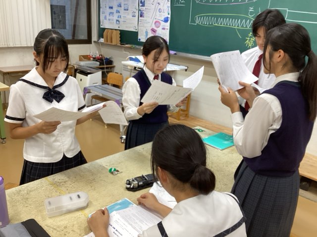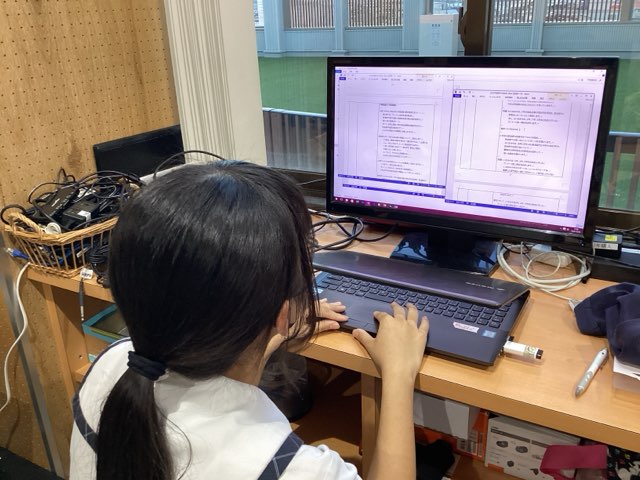 4年生の姿がない・・・と思いきや、技術室で発見!本館にある放送室ではこれまた平成祭に向けて熱の入る吹奏楽部が練習している音楽室が近いので、静かな環境を求めて、技術室を貸して頂いたそうです。毎年4年生が担当するラジオドラマの脚本が完成し、読み合わせと試し録音をしていました。今年のラジオドラマのタイトルは「和んだリング~ミャクミャクがくれた脈~」です。こちらも大阪万博が出てきそうですね・・・。今週中に録音、来週は編集・・・と、平成祭に向けた準備に熱が入っています。