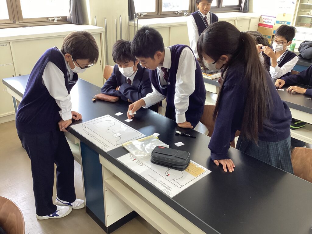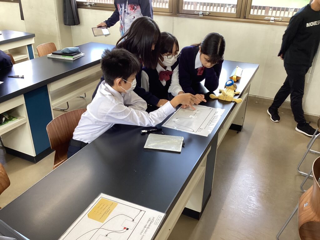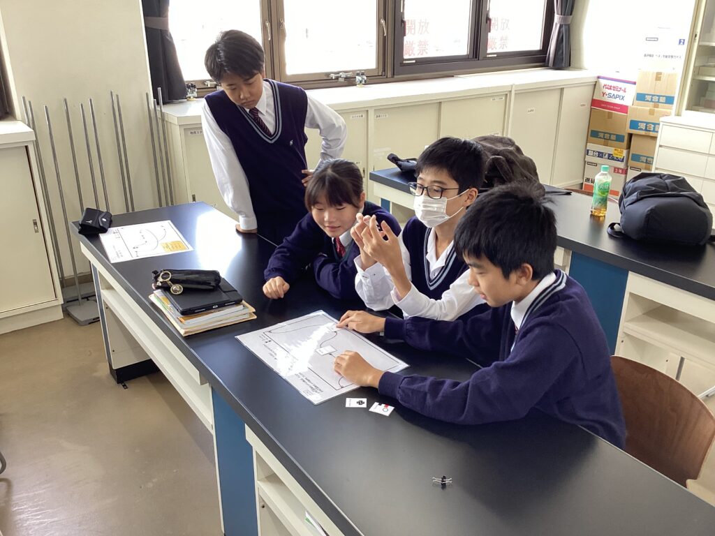 授業では、プログラミングの基本を学びました。生徒たちは班で「話す」「動く」「繰り返す」などの動作をどのような順番で指示をすると効率よく動かせるかを考えました。