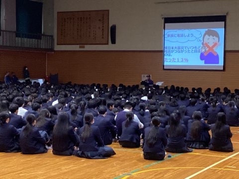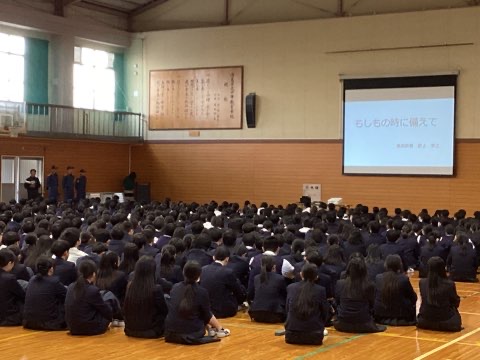 その後、場所をアリーナに移して、松山西消防署の署員の方々による「命の講話」をお聞きしました。
