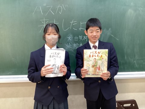 2年生の絵本は『バスが来ましたよ』という、視力を失った人が、10年以上にわたってバスで通学する小学生に支えられながら通勤を続けたという実話をもとにした作品です。