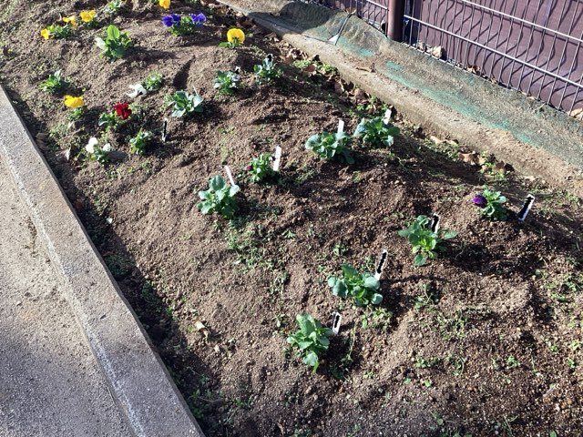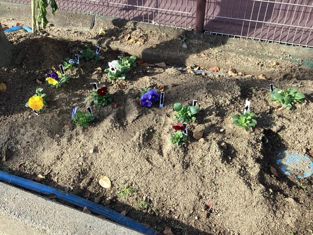 技術の授業で2年生はサクラソウを鉢に、3年生はパンジーを花壇に植えています。