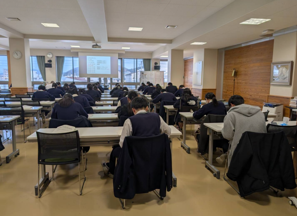 「共通テストチャレンジ」とは、本番と同じ時間割で予想問題に挑み、本番さながらの緊張感を体感する実戦形式の演習です。27・28日に行った1回目では、時間の使い方や休憩中の過ごし方、問題へのアプローチなど、それぞれに課題が見つかった様子でした。