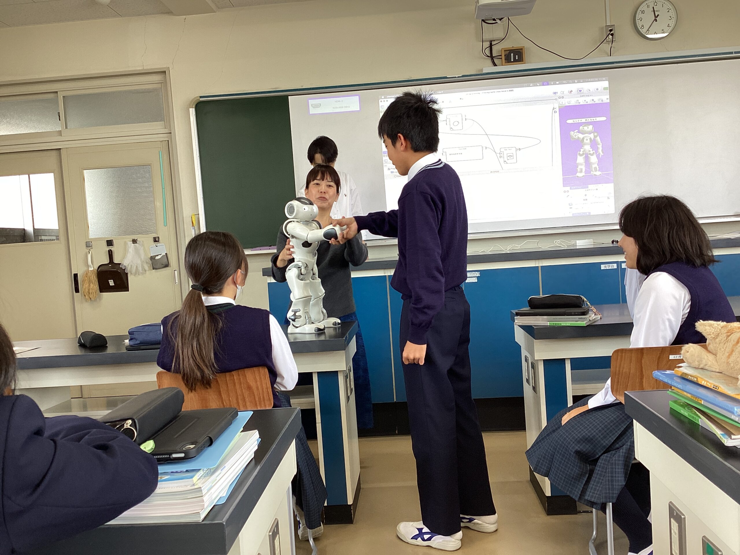 三菱総研DCSの協力のもと、1年生がコミュニケーションロボット『NAO』を活用した特別授業を体験しました。