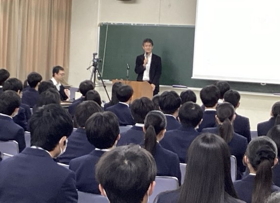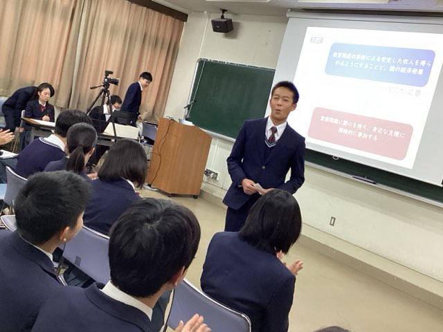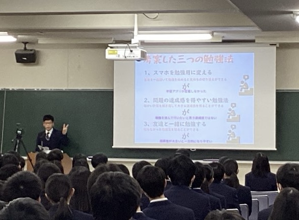 8000字〜10000字、多い人で20000字以上で書き上げた論文を4枚のスライドと約1分の原稿にまとめ、3年生全員や2年生、保護者の方や先生方の前で発表します。この様子はYouTubeでも同時配信されました。