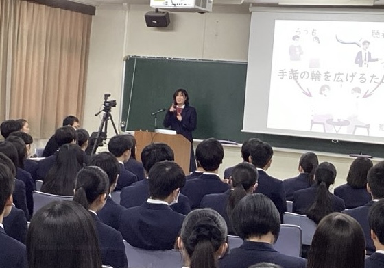 写真やグラフ、イラストを効果的に使って発表します。時には緊張でスライドを切り替え忘れるミスもありましたが、身振り手振りをしながら工夫して限られた時間で伝えることができました。中には聴衆に語りかける人、手話を交えて発表した人も。