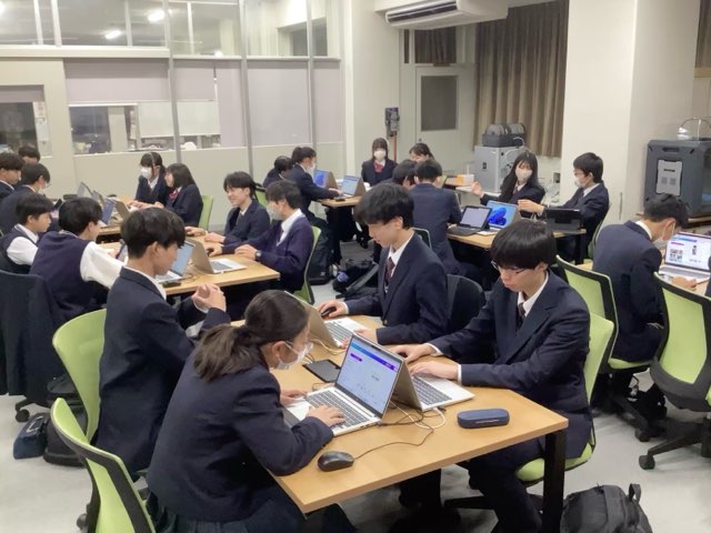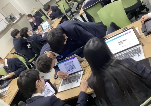 主に放課後の時間を使ってみんなでアイディアを出し合い、発表スライドや動画を作成しています。発表者本人はもちろん、サポーター達も真剣!最終下校時間ギリギリまで、発表をより良いものにしようと頑張っています。