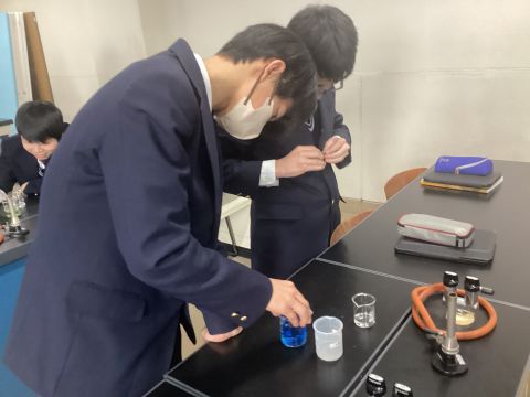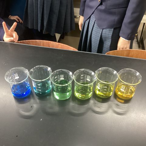 先日、2年生の理科の授業で行われた理科実験の様子です。酸と塩基(アルカリ)を混ぜ合わせて中和の様子を見てみようというわけです。