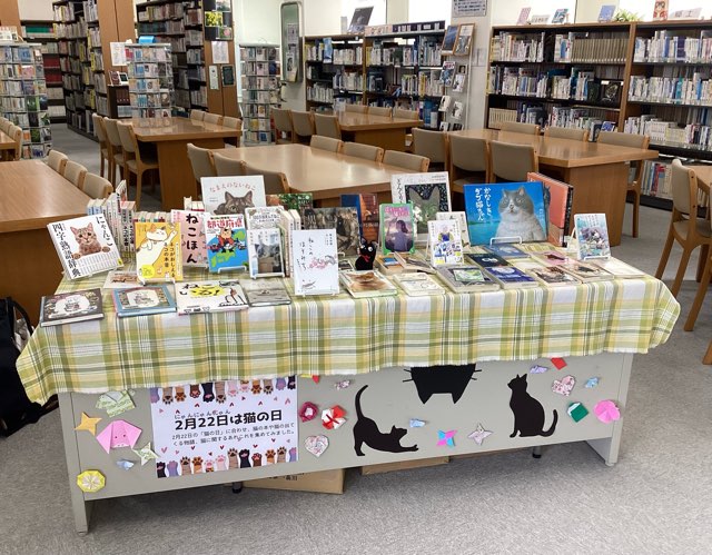 図書館を覗いてみると、「猫の日(2月22日)」にちなんだ特設コーナーが、少し早めにできていました😽可愛らしい猫が登場する絵本や小説などがずらり。