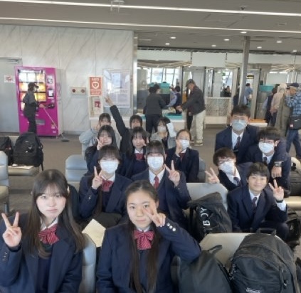 集合時間5分前には全員が揃いました!ゆっくり搭乗を待っています✈️元気に行って参ります!