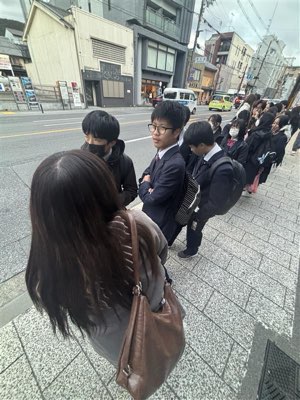 清水寺から京都駅方面へバスで向かうために待っている生徒もいます。しかし、バスはすごく混んでいて、渋滞もあり時間がかかっているようです。