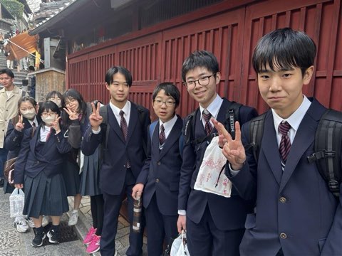 清水寺から八坂神社までは歩いて行けるので、途中の坂で会った班もあります。