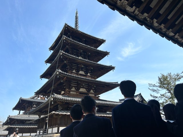 法隆寺は、聖徳太子ゆかりの寺院として知られ、1400年以上前から現在まで大切に守られてきた歴史ある場所です。まず、西院伽藍で、五重塔や金堂などを見ました。長い年月を経てもなお美しく残る建物の姿に、生徒たちも驚いた様子でした。