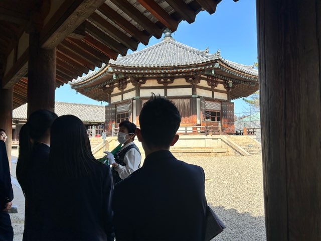 その後訪れた東院伽藍では、八角形の特徴的な建物である夢殿を見学しました。ここには、長い間秘仏として守られてきた救世観音像が安置されており、聖徳太子の姿を表したものとも伝えられています。聖徳太子への信仰や当時の人々の思いについて考える機会となりました。