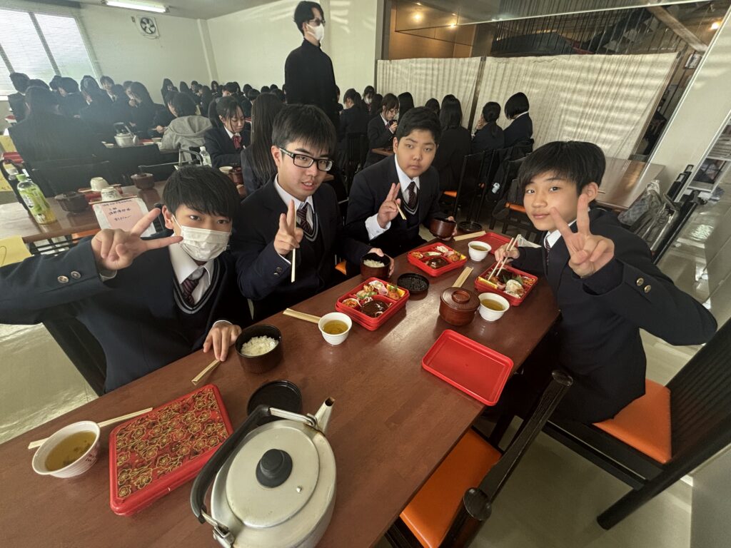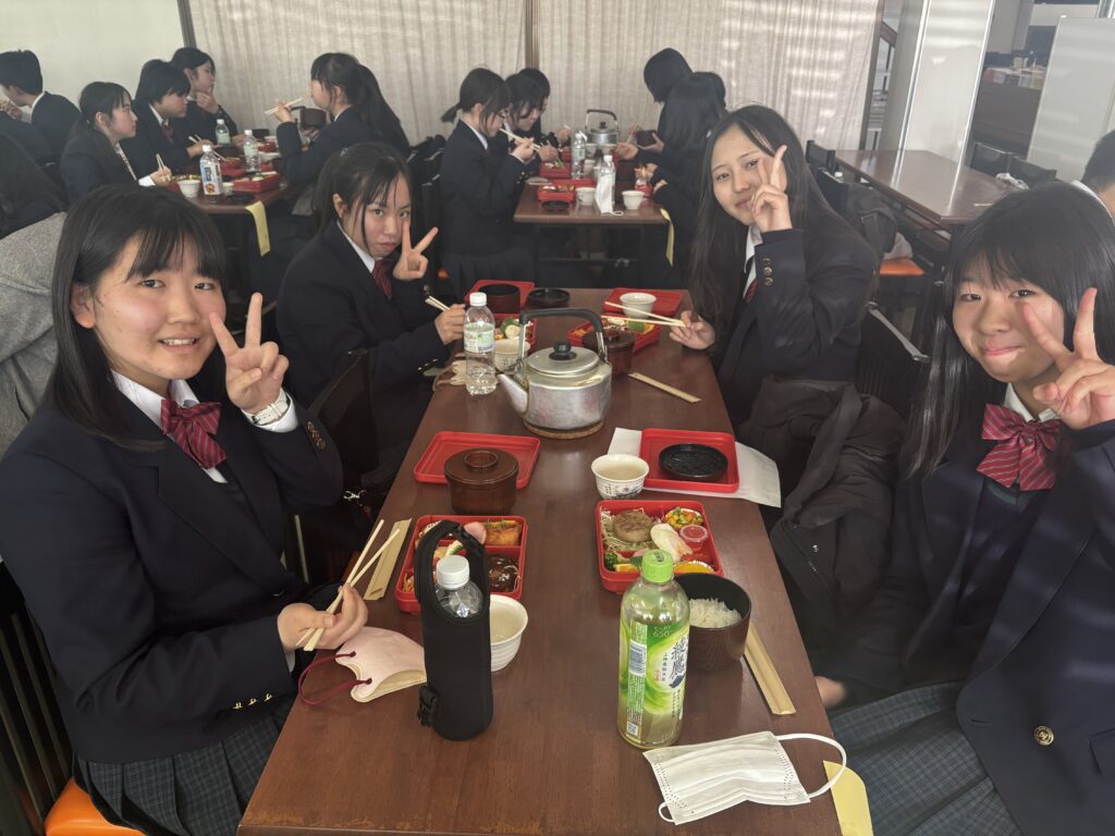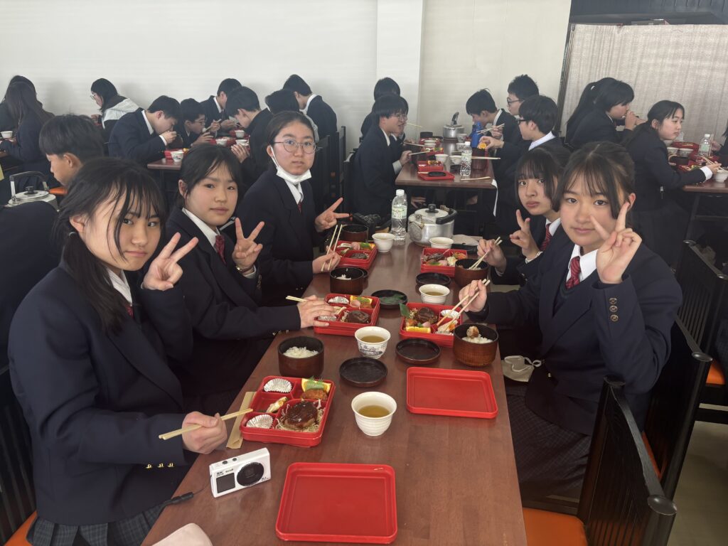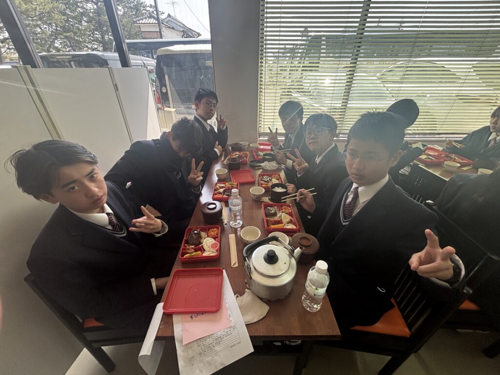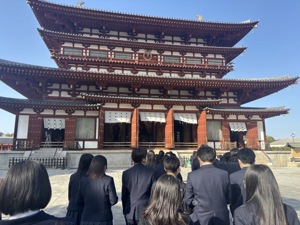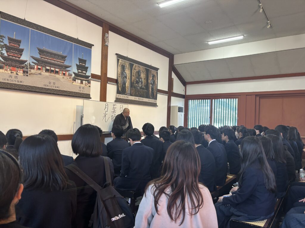 法隆寺で昼食にお弁当を食べた後は薬師寺へ。特徴的な色遣いが映える金堂と西塔は再建されたもの、東塔は現存する最古の三重塔です。塔は実はお墓の意味で、一番重要なのはてっぺんの部分なのだとか…。本校の講演会にもお越しくださったお坊さんとはまた別の方による法話をいただきましたが、話が大変上手で生徒らは爆笑していました。